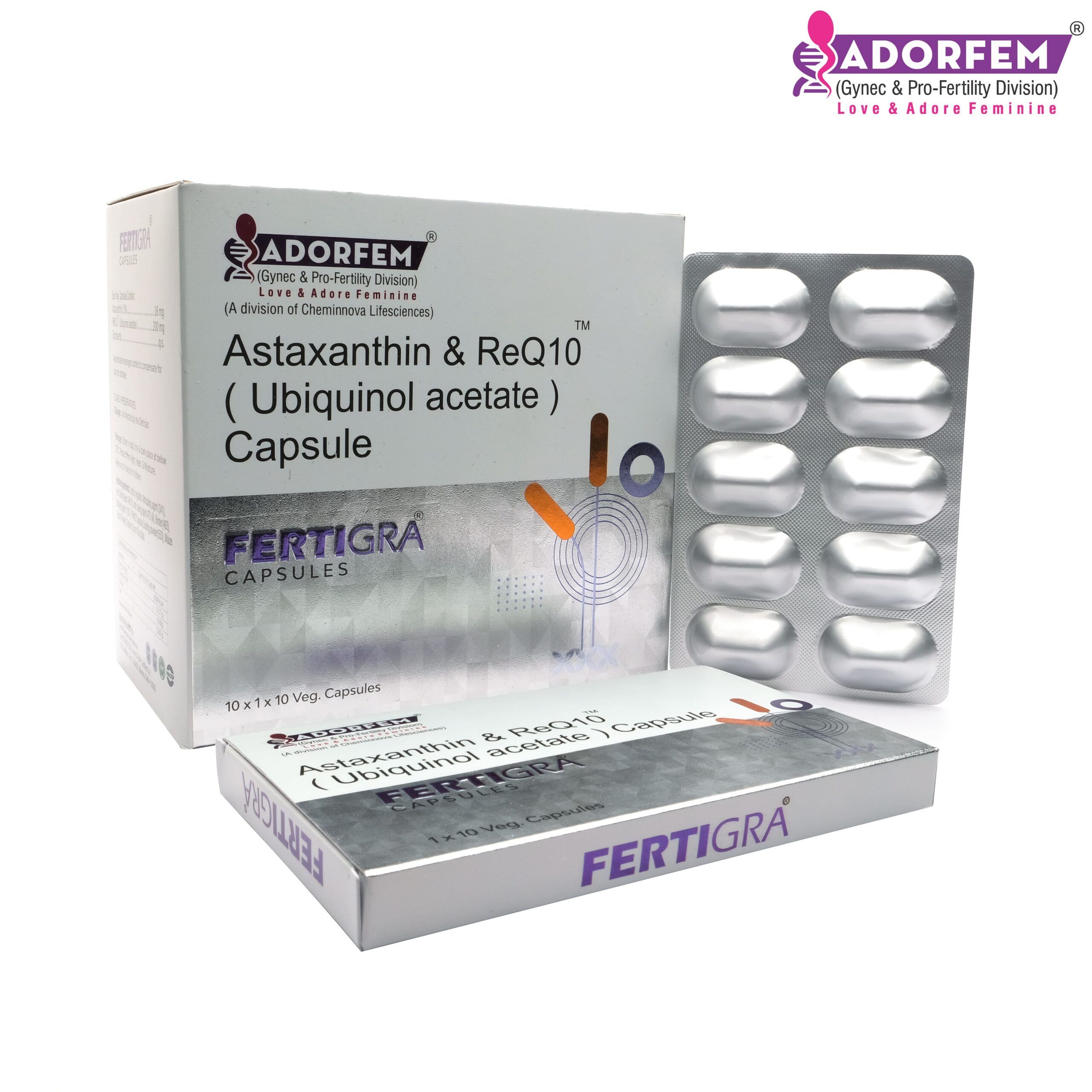 Adorefem is a leading gynecology medicine company in India that is known to offer a premium range treating infertility cases in both men and women. The Astaxanthin and Coenzyme Q10 Capsules are available at our company under the brand name Fertigra at affordable rates. Contact us to know more!