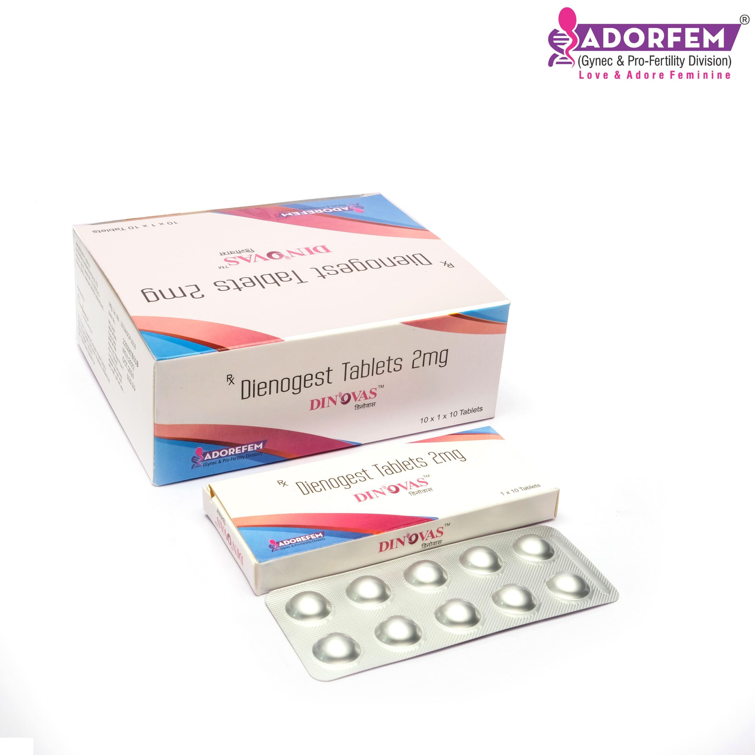 Dienogest Tablet – Dinovas Tablet is a member of the progestin class of medications used to treat excruciating endometriosis symptoms. The tissue that normally lines the endometrium (within the uterus) can grow outside the uterus in endometriosis, a painful condition. Fallopian tubes, pelvic lining, and ovaries are frequently affected by endometriosis. It contains “Dienogest,” which inhibits the release of the hormone estradiol, which stimulates excessive endometrial development. Thus, the tablet aids in the treatment of endometriosis-related pelvic pain.