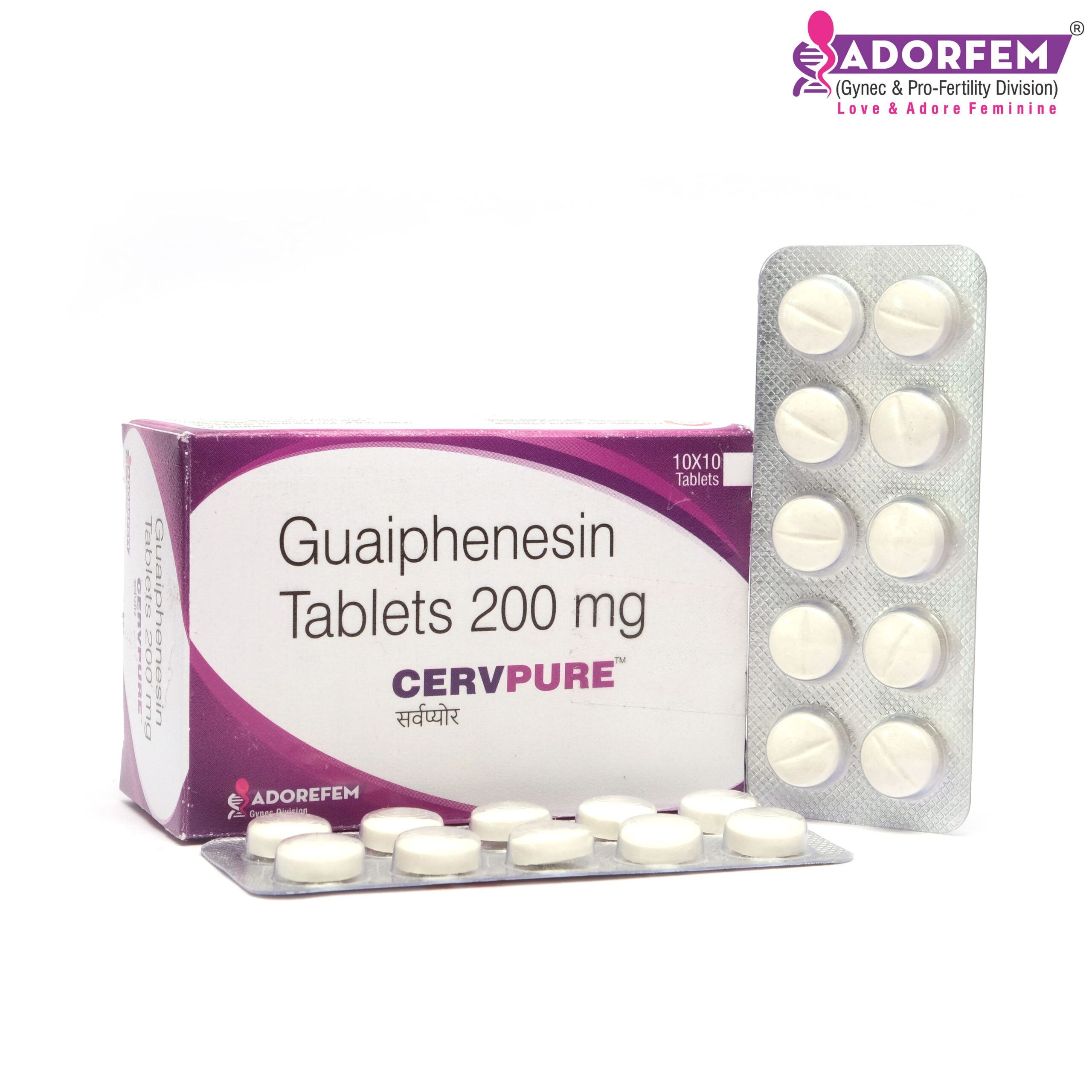 Guaiphenesin Tablets – Cervpure-Tablet is a member of the expectorant drug class, which is generally used to treat coughs that produce mucus. The vast breathing passages can be cleaned of fluids, irritants, foreign objects, and bacteria with a swift evacuation of air. Coughs come in two flavours: dry cough and chesty cough (wet cough). A chesty cough (wet cough) means mucous or sputum is generated to help clear your airways, but a dry cough is tickly and doesn’t produce any nasty or thick mucus. Guaifenesin is mostly used to treat wet cough.