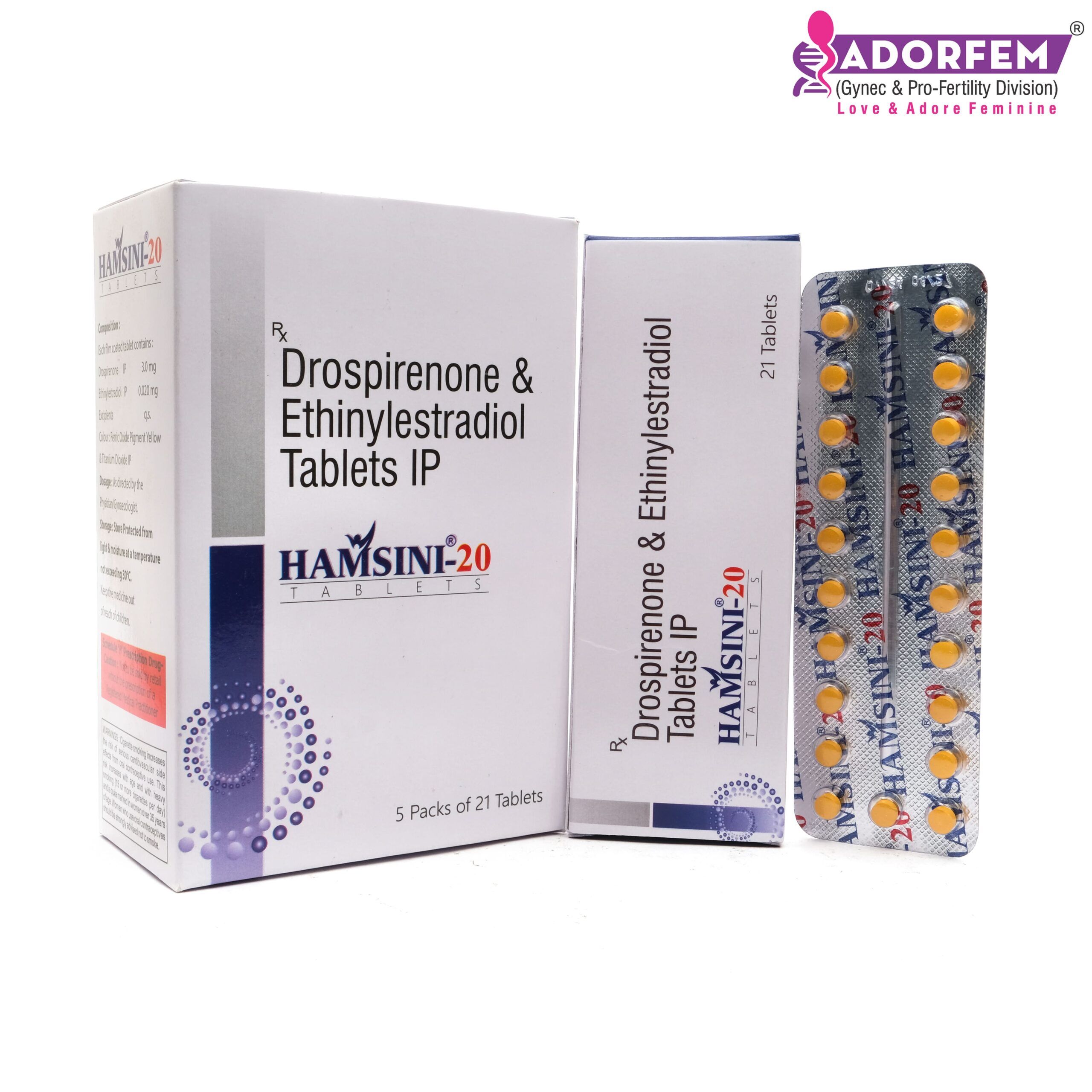 Drospirenone and Ethinyl Estradiol Tablets are a type of combined hormonal contraceptive pills used to prevent pregnancy. Adorefem manufactures such tablets under the branding of HAMSINI 20 TAB. Drospirenone is a synthetic progestin hormone and Ethinyl Estradiol is a synthetic estrogen hormone. Together, they work to prevent pregnancy by hindering the fertilized egg from fusing with a sperm, hence, preventing conception.