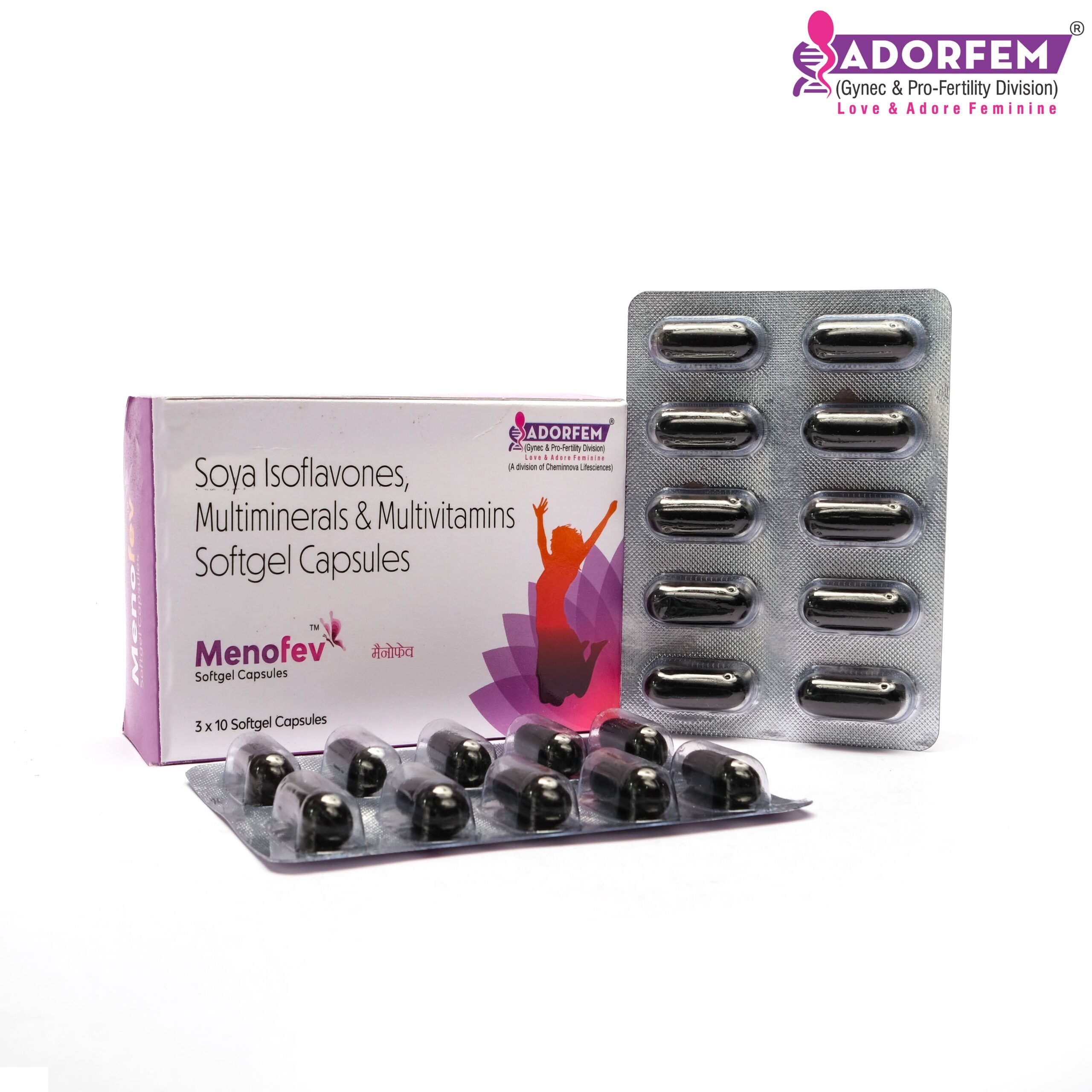 Isoflavones, Vitamins and Micronutrients Soft Gel Capsules, under the branding of Menofev are a composition of this product is a family of phytoestrogens, which are used to treat Combatting menstrual issues, Treating acne, Fighting breast cancer, Promoting heart health.