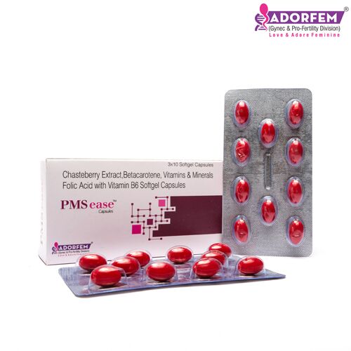 PMS EASE Softgel is a combination of Chasteberry Extract 20 Mg Beta Carotene 15mg + Vitamin d3 400 IU + Vitamin B6 40 mg + Vitamin B12 15mcg + Folic Acid 1.5 mg + Niacinamide 30 mg + Ferrous Fumarate 20mg + Magnesium Hydroxide 100mg + Pottasium Iodine 100mcg + Zinc Sulphate 41.2mg + Copper Sulphate 4mg + Chromium Amino Acetate 50 mcg is meant to boost energy and stamina in women and work on skin health. These multivitamins also improve immunity and help to lower oxidative stress which helps in higher energy production in the cells. They are filled with antioxidants that keep the skin safe from all kinds of free radicals. Together, it helps to improve the overall well-being of women and brings a lot of benefits to skin, hair, and nails.